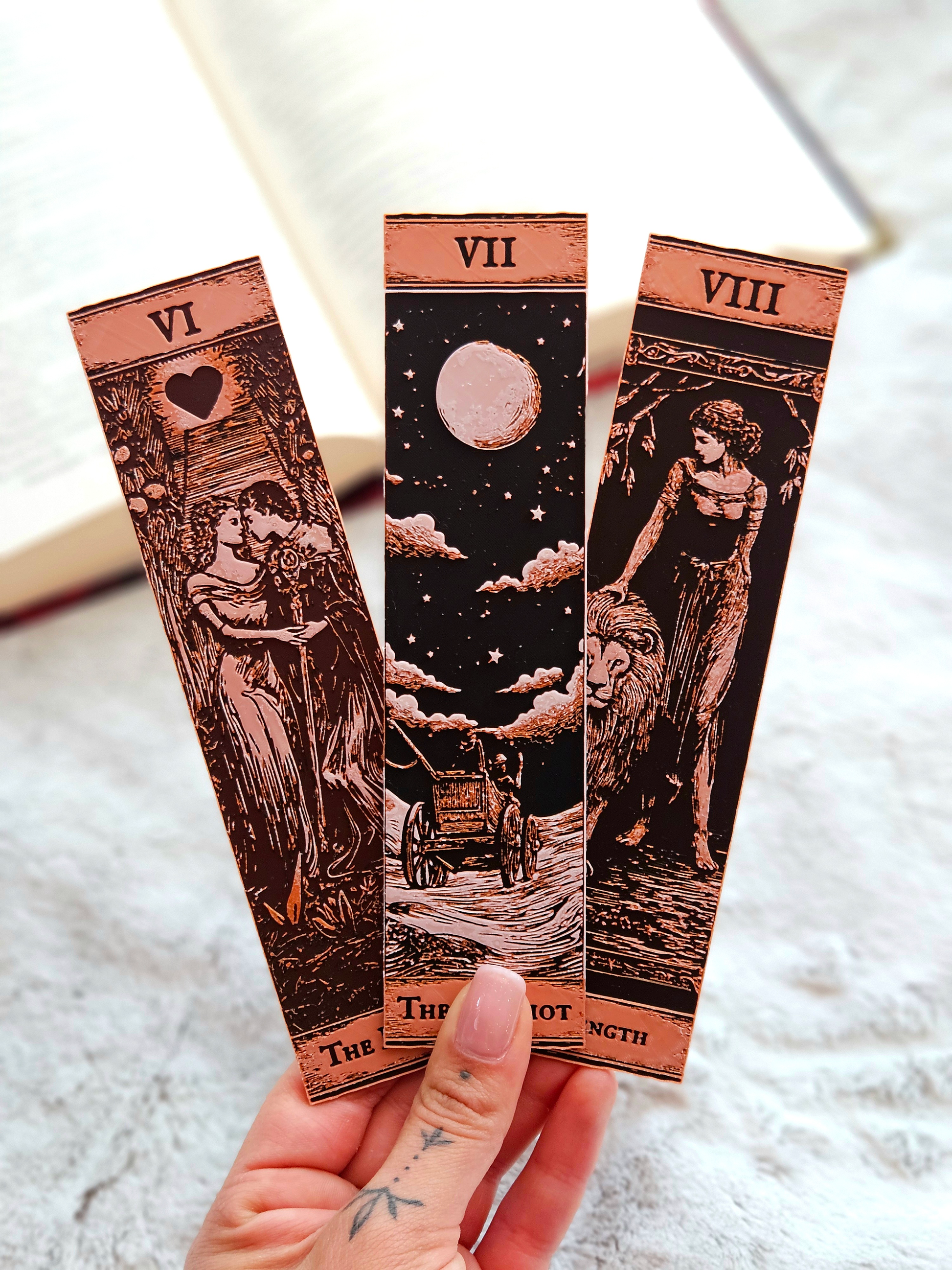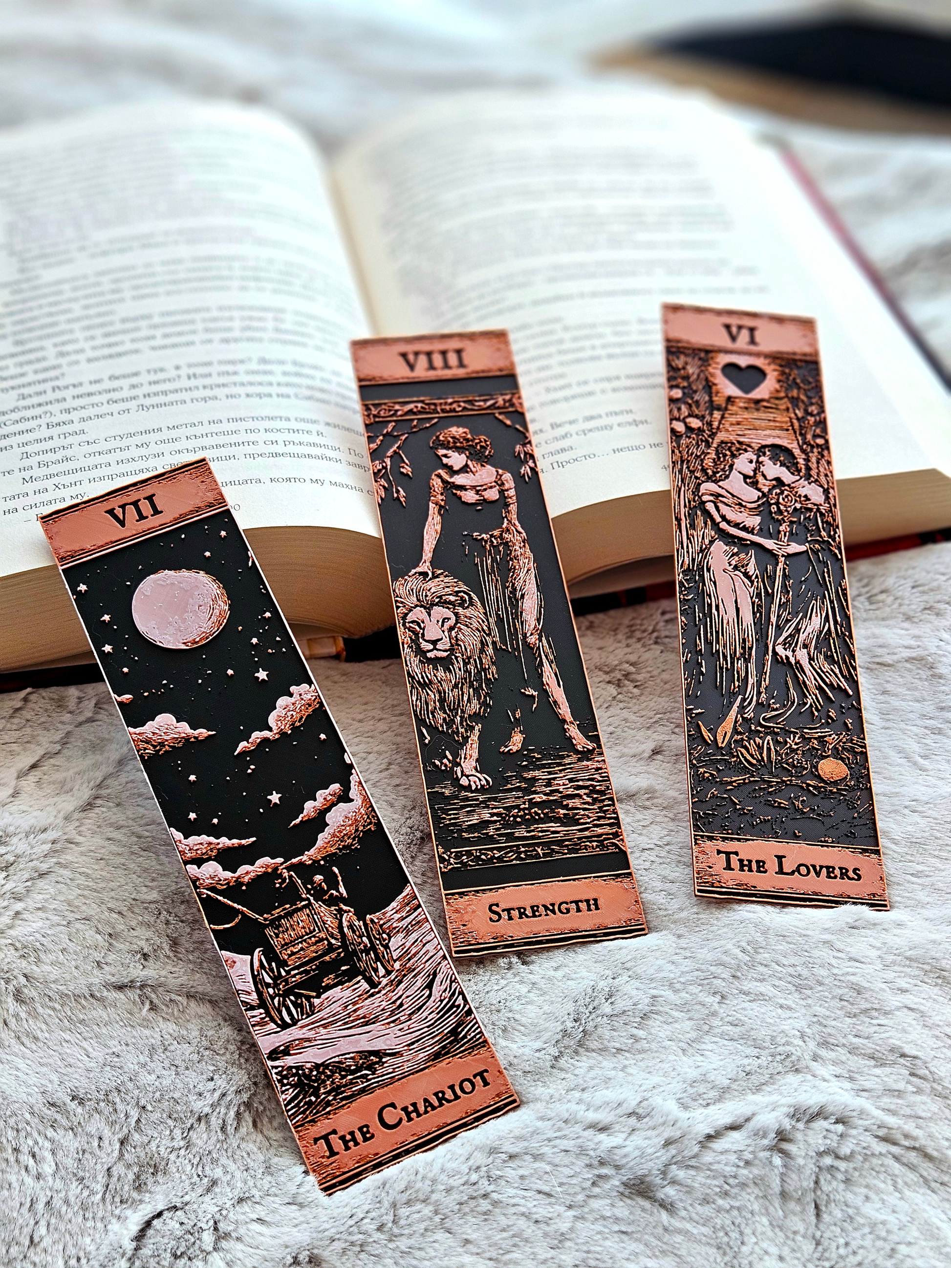 Esplora i segnalibri audaci ispirati ai Tarocchi di Siviglia, con i celebri arcani maggiori: Gli Amanti, Il Carro e La Forza. Ogni segnalibro cattura l'intensità e il simbolismo di queste figure classiche, perfetto per chi desidera un tocco di mistero e passione nelle proprie letture. Un set che sfida la quotidianità, trasformando ogni pagina in un viaggio di forza, amore e conquista.